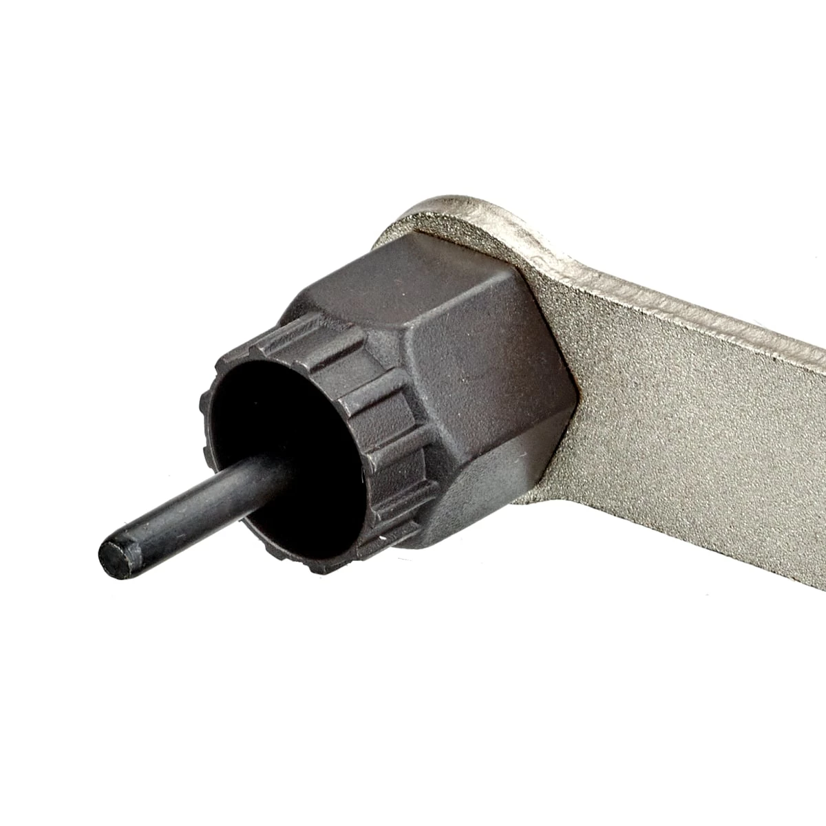 ROSE removal tool with padded handle and long guide pin. The pin into the hub axle to provide a secure hold.
